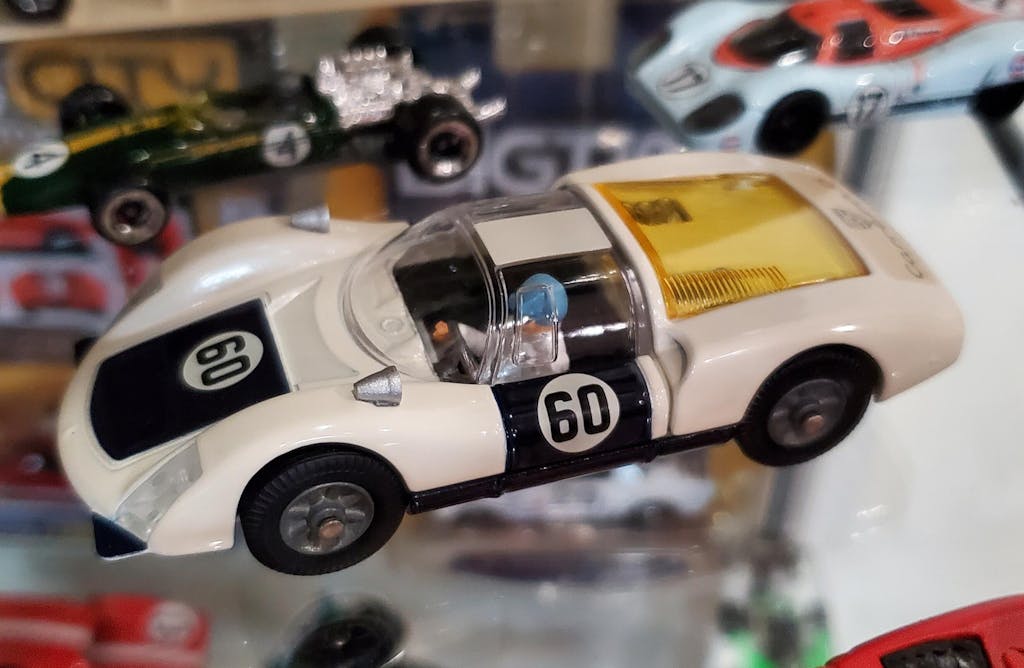 Awesome lilac purple colored mid 60's Mustang with the "Flower Power" tampos on the roof, doors, hood and trunk lid. Opening doors with retractable light blue bucket seats and dash with steering wheel inside and jewel style headlights. The tires are on a retractable suspension too. All around a really nice model that is a lot of fun to look at!