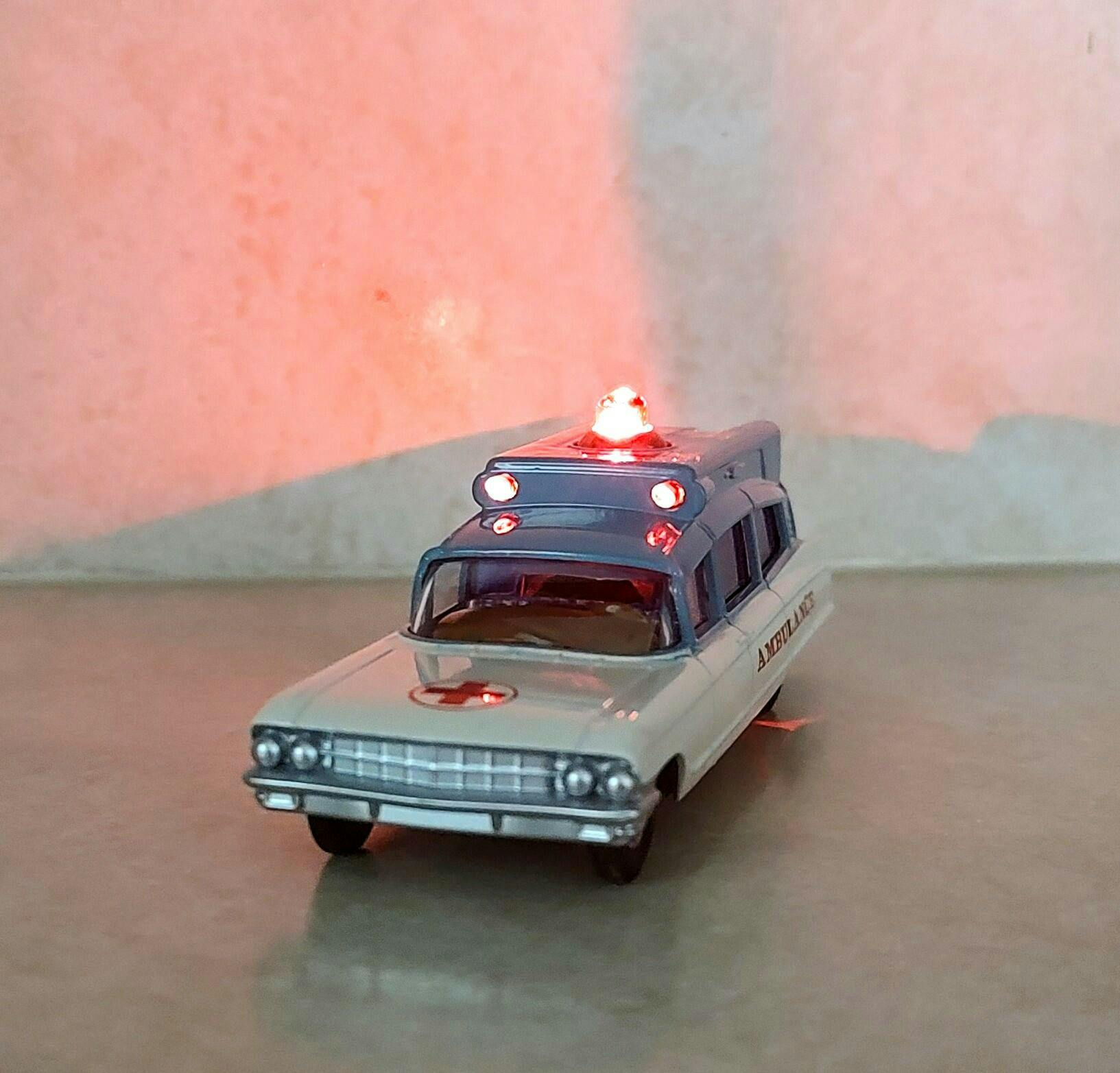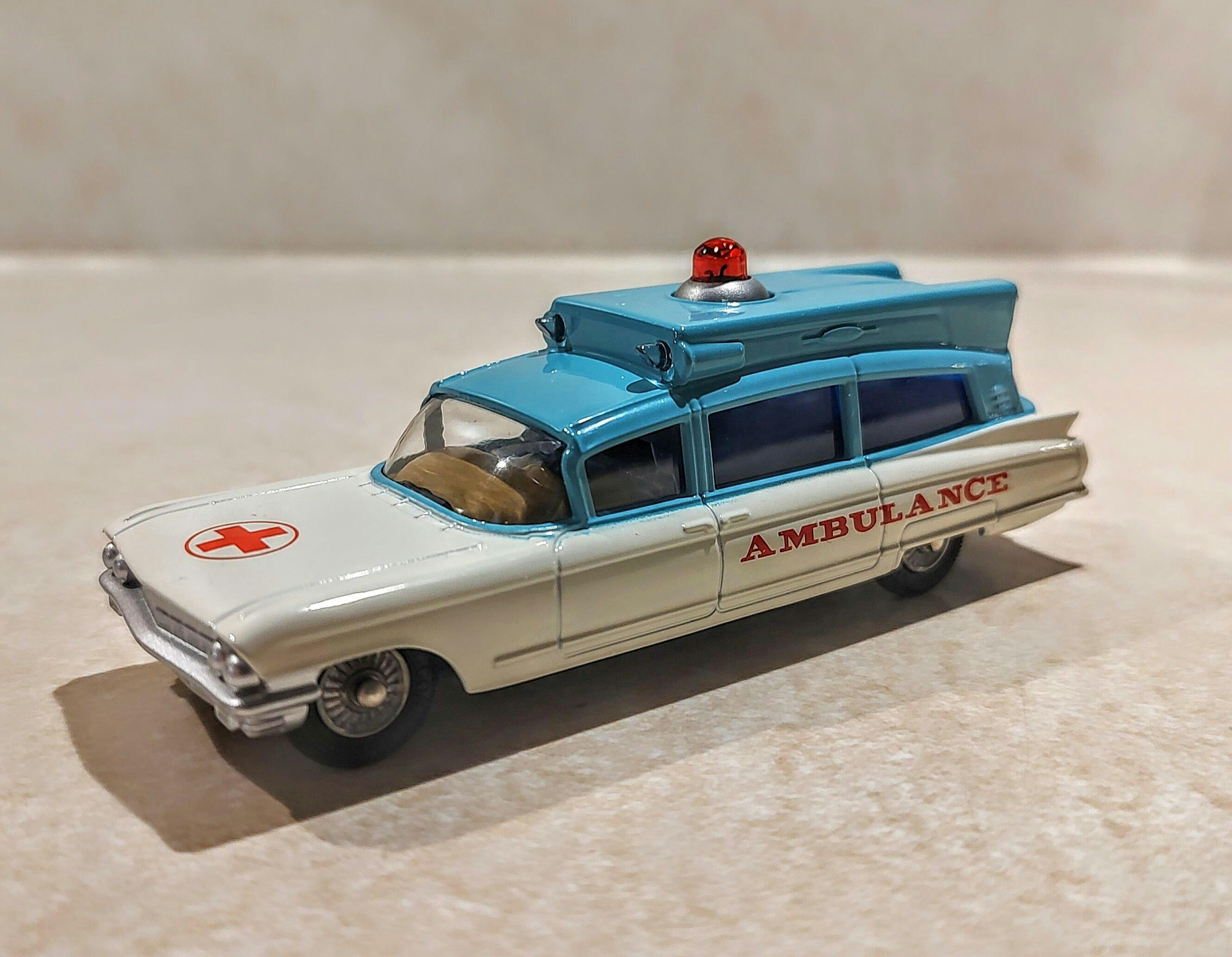 Featuring Corgi’s innovative ‘Trans-O-Lite’ battery operated lighting system, all four corner roof lights of this wonderful die-cast Cadillac Superior Ambulance model illuminate, as well as the main emergency beacon. The first issue of the model, from 1962, had an ingenious but erratic switch on the rear axle, simulating ‘flashing’ emergency lights when the model was pushed along the floor. A follow up version from 1966 omitted the temperamental axle switch but retained the clever ‘Trans-O-Lite’ system. This is the version we have chosen to replicate.