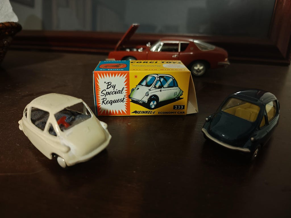 Who would have thought, that 60 years ago, a simple purchase made by my dad from the dedicated toy room of the very large uptown Charlotte, NC Sears store, of a tiny Heinkel Bubble Car along with some other CORGI models, would lead to my lifetime love and adoration of these little Heinkels. Sixty years later, I still have that Heinkel, albeit well-played with and well-worn. Although a very amateurish restoration some thirty plus years ago has kept it presentable, I always wanted a new one. Thank you, CORGi Model Club for this reissue. I received mine today and I am very pleased with it as it is very faithful to, and does the original edition justice. Here is the new one along with my treasured original!