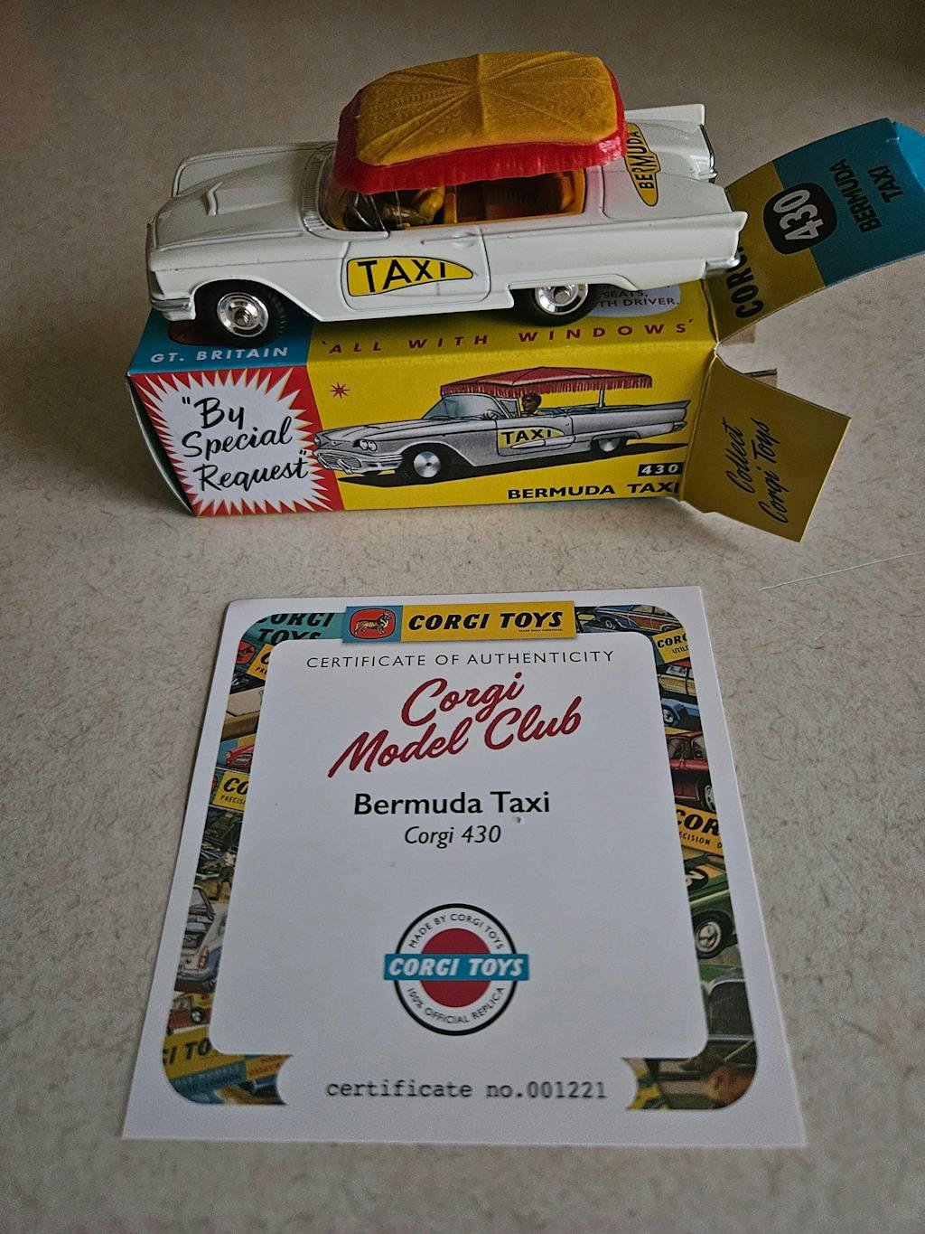 The model was available in only white but the canopy came in a number of variations, in yellow, green or blue, with contrasting fringes in the same set of colours. All have a mustard yellow interior. Just under 300,000 were produced until the model was deleted in 1964. Interestingly, the later Corgi Chrysler Imperial (Corgi 246) was also going to be produced in a Bermuda Taxi guise, as Corgi 507. However, despite appearing in the 1969 catalogue it never went into production.