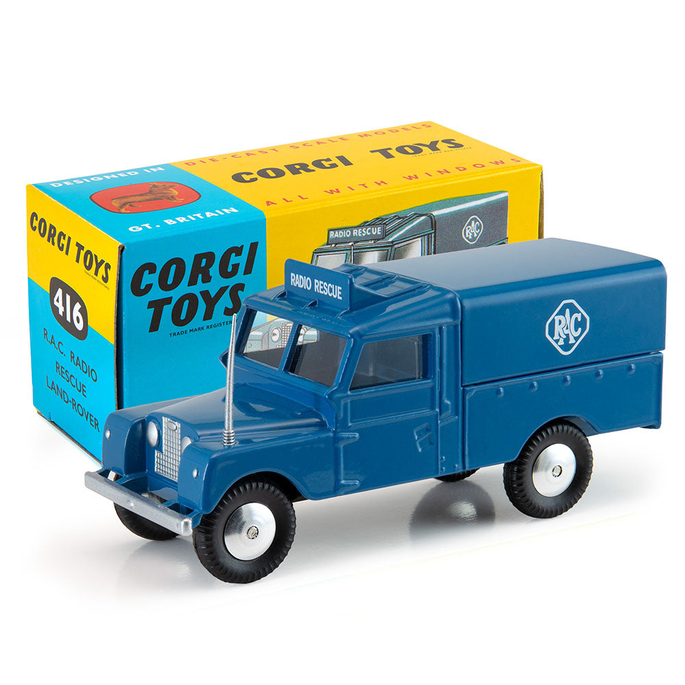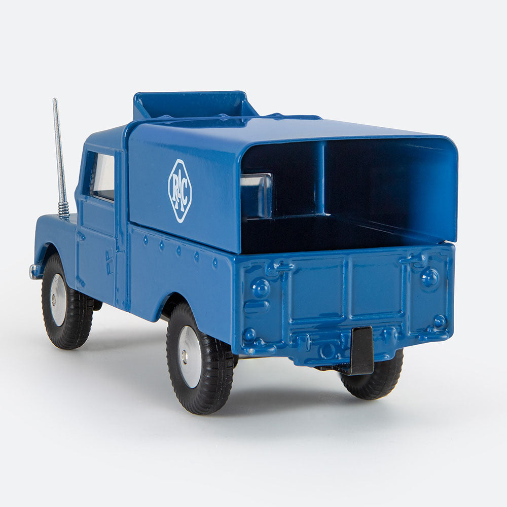 This ‘Series 1’ Land Rover was introduced into the Corgi range in 1959, a re-liveried version of Corgi 351 from the previous year. It omits 351’s bonnet-mounted spare wheel but added an aerial and a roof-mounted Radio Rescue sign, retaining the earlier model’s tinplate ‘tilt’, now with an RAC logo. Just over 200,000 were made, production ending in 1962.